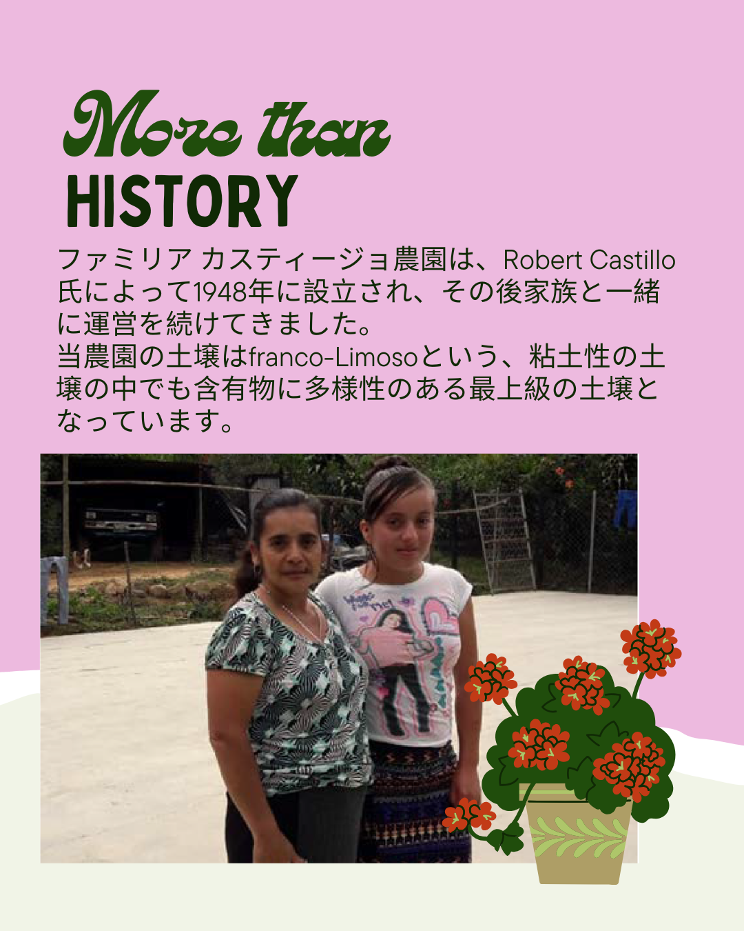 ファミリア・カスティージョ農園は、グァテマラ北西部、メキシコとの国境近く,標高1670m~2000mに位置します。ロベルト・カスティージョ氏によって1948年に設立され、その後家族と一緒に運営を続けてきました。この農園の土壌は粘土性の土壌の中でも含有物に多様性のある最上級の土壌となっています。